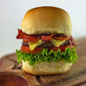 Pão, carne, queijo, bacon, alface, tomate e molho.