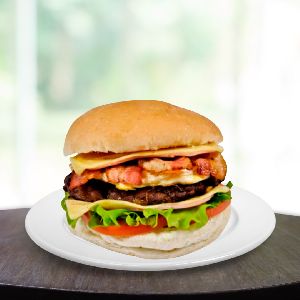 Pão, carne, queijo, ovo, bacon, alface, tomate e molho
