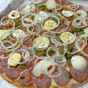 azeitona, calabresa, cebola, mussarela, oregano, ovo, pimentao, tomate